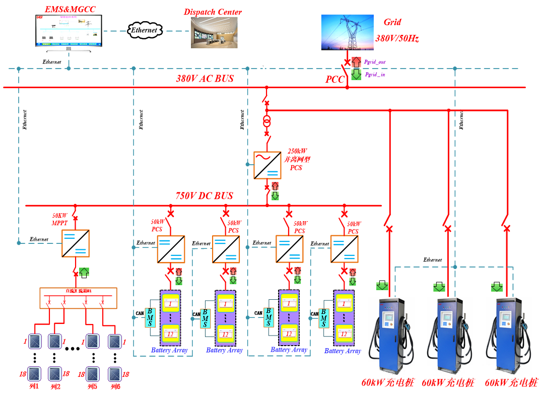 5. 充電樁:系統含3臺60kW充電樁,充電樁的交流側并入交流母線,可由光伏、儲能和電網供電。